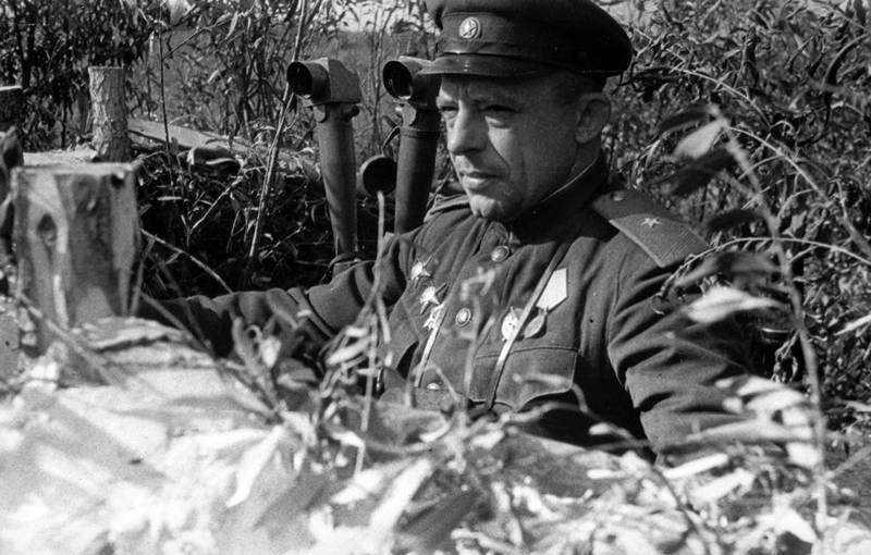 Командир 72 гв. сд генерал-майор А.И. Лосев на передовом наблюдательном пункте. Июль 1943 г. (РГАКФД)