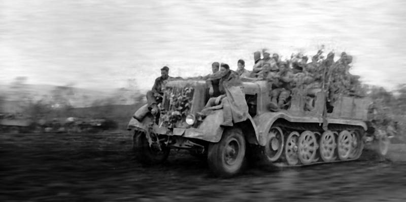 Группа бойцов и командиров 201 отбр на трофейном полугусеничном транспортере-тягаче «Даймлер-Бенц DB10» (Sd.Kfz.8) двигаются в район боевых действий. 9 июля 1943 г. (Фонды Государственного историко-мемориального музея-заповедника «Сталинградская битва»)