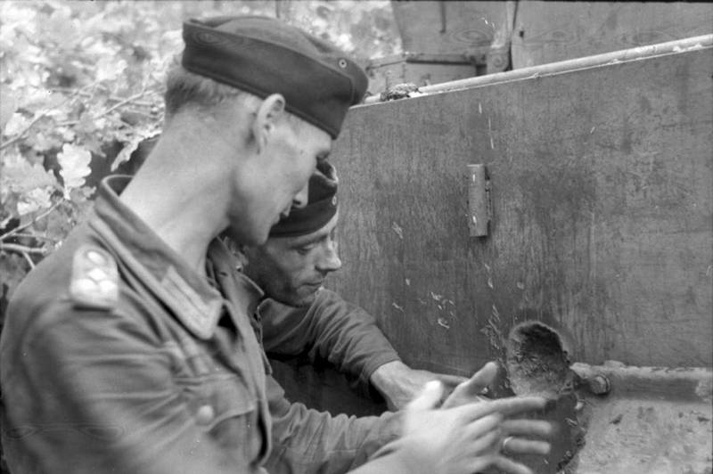 Танкисты 503 ттб осматривают место попадания советского бронебойного снаряда в корпус танка «Тигр». Июль 1943 г. (Bundesarchiv)
