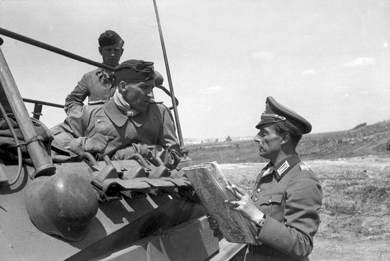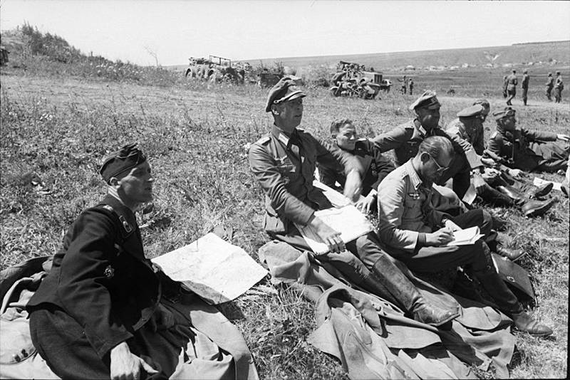 Командир 6 тд генерал-майор В. фон Хюнесдорф (на бронетранспортере Sd.Kfz.250/3) слушает доклад командира 2-го батальона 114 тгп капитана Некснауэра в районе с. Белинская в долине р. Разумная. 7 июля 1943 г.(Bundesarchiv)