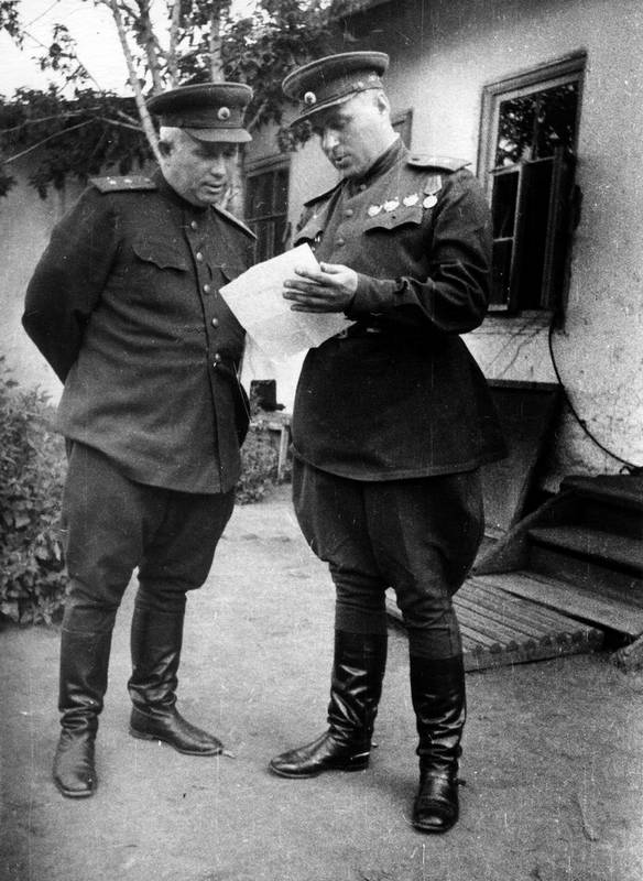 Начальник штаба Воронежского фронта генерал-лейтенант С.П.Иванов (слева) обсуждает документ с членом Военного совета фронта генерал-лейтенантом Н.С.Хрущевым. Район ст. Ржава. Июль 1943 г. (РГАКФД)