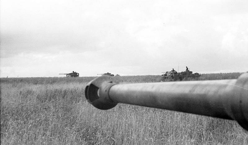 Бронегруппа одной из дивизий 3 тк в составе Т-6 (на втором плане слева), Т-3 и Т4 (справа) в ожидании начала атаки. На первом плане ствол орудия «Тигра». Июль 1943 г. (Bundesarchiv)