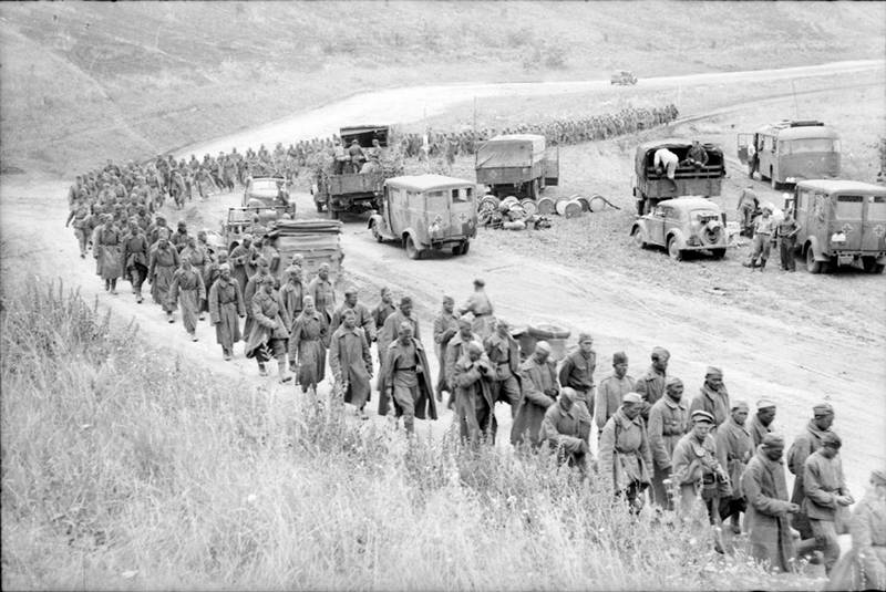 Колонна пленных красноармейцев и командиров 69А, взятых в плен войсками армейской группы «Кемпф», двигается в тыл. Июль 1943 г. (Bundesarchiv)
