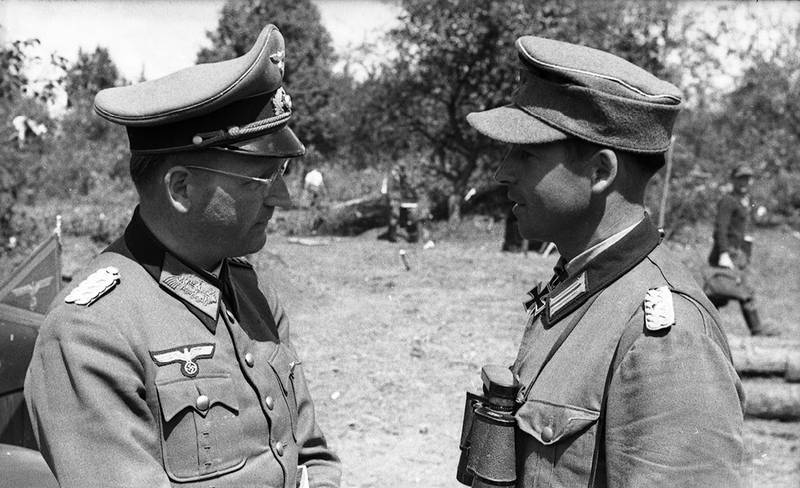 Начальник штаба АГ «Кемпф» генерал-майор Х. Шпайдель (слева) беседует с командиром 305 грп 198 пд АГ «Кемпф» майором Й. Грассманом. Район восточнее Белгорода. Июль 1943 г. (Bundesarchiv)