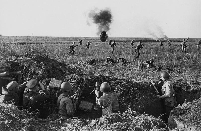 Командир стрелкового подразделения 69А наблюдает за началом атаки. На первом плане расчет 50-мм ротного миномета поддерживает атакующих огнем. Июль 1943 г. (РГАКФД)