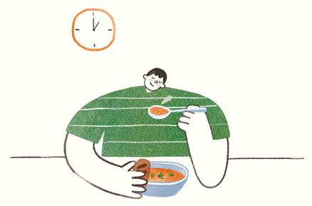 Во время основного приема пищи (завтрак, обед и ужин) твоя тарелка должна напоминать тарелку на картинке: белковое блюдо, продукт из цельного зерна, овощи, фрукты и масло (добавляется в салат и во время приготовления горячего) – хорошее комбо, которое обязательно порадует твой желудок. Кстати, на обед вместо салата можно съесть овощной суп.