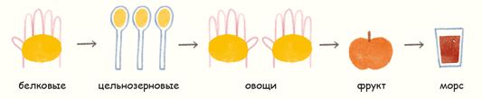 Но можно обойтись и без весов и мерить в ложках и ладошках. Лови инструкцию: белковые продукты = ладонь без пальцев, цельнозерновые = два небольших тоста или три столовые ложки гарнира, овощи = горсть из двух ладоней, фрукт = один (давай без шуток про арбуз), компот или морс вместо фрукта = стакан.
