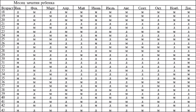 Также одним из распространенных методов планирования пола является Древнекитайская таблица определения пола будущего ребенка. Китайские медики считают, что она верна на 99 %. Все, что необходимо знать, – это месяц зачатия ребенка и возраст матери во время зачатия. По вертикали указан возраст, когда вы решили стать мамой, а по горизонтали – месяц зачатия ребенка.