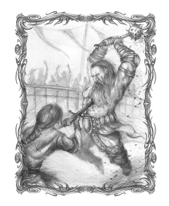 Следующим на арену поднялся гном, покручивая в руках две булавы. Осторожно двигаясь по кругу, он присматривался ко мне. Боец знал, что перед ним, как минимум, маг двух элементов, поэтому выбирал тактику. К концу второго круга он, видимо, определился, да и посвистывания в толпе подстегивали.