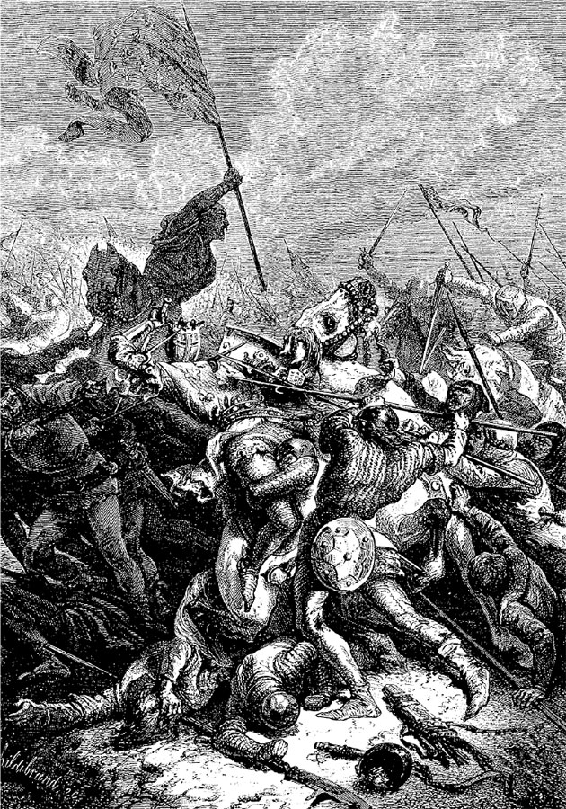 Английская и нормандская армии встретились в отчаянном бою близ Гастингса, и победа долго и упорно оспаривалась. Нормандцы имели изрядный перевес, так как находившиеся среди них многочисленные отряды лучников, вооруженных большими луками, наносили сильный урон англичанам, в то время как те, из-за отсутствия у них достаточного количества стрелков, лишь метали руками короткие копья, или дротики, не залетавшие далеко. И все же исход битвы оставался неясным, хотя она длилась с девяти утра до глубоких сумерек, пока стрела не пронзила голову короля Гарольда и он не рухнул замертво[12]12