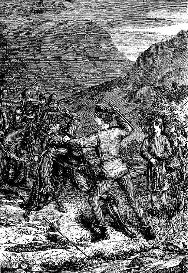 Однако на то, чтобы восстать с оружием в руках, его толкнул случай, по преданию произошедший в городе Ланарке. Уоллес жил там со своей женой, местной уроженкой. Однажды, когда он шел по рынку в ярко-зеленом платье с великолепным кинжалом на боку, какой-то англичанин придрался к его наряду: мол, шотландцам не след щеголять в таких ярких одеждах и носить такое красивое оружие. Само собой, завязалась драка, и Уоллес, заколов англичанина, заперся в собственном доме, который вскоре был осажден всем английским гарнизоном. В то время как англичане ломились в переднюю дверь, Уоллес выскользнул из задней и спрятался в диком скалистом ущелье близ Ланарка, называемом Картленд-Крэгз, заросшем кустами и деревьями и полном отвесных утесов, где, он знал, английским солдатам вовек его не найти[28]28