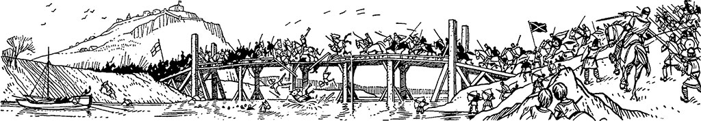 Так авторитет Уоллеса день ото дня рос, и к нему примкнуло немало шотландских аристократов. Среди них были сэр Уильям Дуглас, властелин Дугласдейла и глава могучего рода, часто упоминавшегося в шотландской истории, и сэр Джон Грэм, который стал ближайшим другом и советчиком Уоллеса. Однако многие из этих высокородных вельмож изменили делу страны при приближении многочисленной и прекрасно вооруженной армии под водительством Джона Уоррена, графа Суррейского, английского наместника Шотландии. Они подумали, что Уоллес не в состоянии будет отразить натиск стольких блестяще вымуштрованных воинов, и поспешили сдаться на милость англичан из страха потерять свои имения. Тем не менее Уоллес сохранил присутствие духа и значительную часть войска. С ней он и расположился лагерем на северном берегу реки Форт близ города Стерлинга. Там через реку был переброшен длинный деревянный мост, примерно милей выше того места, где выстроен нынешний.