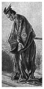 Подождав с четверть часа, в которое время японцы между собой разговаривали, шутили и смеялись, вдруг из-за ширм услышали мы шорох идущих людей. Тогда один из чиновников произнес: «Ши», и в ту же секунду водворилось глубокое молчание. Сначала вошел японец, просто одетый, у самого входа присев на колени, положил руки ладонями на пол и наклонил голову. За ним вошел буниос в простом черном халате, у которого на рукавах, так, как и у всех японцев, вышит его герб. За поясом имел он кинжал, а саблю нес за ним один из пяти человек (считая и того, который шел впереди) его свиты, держа ее за конец эфесом вверх и в платке, так что голыми руками до нее не касался.
