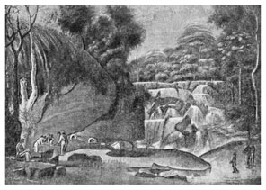 11 ноября, по приглашению нашего консула, ездил я с некоторыми из наших офицеров и гардемаринов верст за 25 от города смотреть водопад: место очень любопытное. При конце обширной плодоносной и весьма хорошо обработанной долины, окруженной с трех сторон превысокими горами и с одной стороны морем, находится сей водопад, низвергающийся двумя уступами, каждый из коих имеет вышины сажен до 40. Подле же самого водопада, под огромным камнем, находится пещера, в коей поставлены две из камня иссеченные ниши, наподобие киотов, и из камней сложены стол и скамейка. Здесь, сказывают, лет за сто пред сим, во время осады Рио-Жанейро французами,[187]187