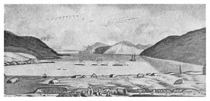 Я приказал поднять наш флаг и выпалить из пушки, думая найти тут промышленных Американской компании; они могли бы к нам приехать и доставить некоторые сведения об острове. В то время бросили мы лот и нашли глубину 33 сажени, на дне мелкий, черный с серым песок.