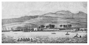 27-го октября в 8-м часу утра поехал я с некоторыми из своих офицеров на берег; при проезде моем мимо американских судов они салютовали мне по 7 выстрелов с каждого, а при выходе на берег с крепости из 5 пушек. На салюты сии после мы отвечали со шлюпа. На берегу встретили нас все американские капитаны, начальник острова и начальник морских сил короля овайгийского.