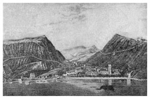 Город Св. Иакова (James Town), который один только и есть на всем острове, стоит на северо-западной стороне оного, на берегу моря, в так называемой Церковной долине, которая находится между двумя высокими горами, возвышающимися почти перпендикулярно; расстояние между горами не более полуверсты. Равнина, где стоит город, от моря внутрь острова возвышается постепенно на небольшое расстояние, потом вдруг начинаются крутые горы, по которым нет другого способа ездить, как верхом, и то по тропинкам, с великим трудом проложенным. Другого экипажа здешние жители не видали: даже дамы на бал ездят верхами. С гор нередко скатываются камни и причиняют вред жителям: за несколько дней до нашего прихода на одной из батарей двух солдат убило скатившимися с гор камнями.