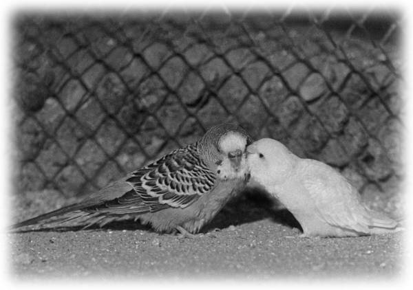 Она сидела и днём и ночью и даже не слетала за едой. Кормил свою подружку зелёный попугайчик, кормил прямо изо рта, как птенчика, а если самочке хотелось полетать, он сменял её и садился греть яйца.