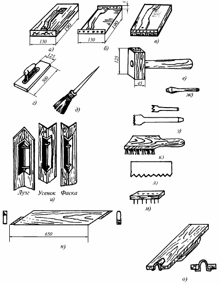 Рис. 2. Инструменты для отделки штукатурки: а) деревянная терка; б) универсальная терка для крепления войлока; в) универсальная металлическая терка для крепления деревянного полотна; г) гладилка; д) кисть (окамелок); е) бучарда; ж) зубило; з) троянка и зубчатка; и) фасонные полутерки; к) стальная щетка; л) цикля; м) гвоздевая щетка; и) штукатурная линейка; о) рустовка
