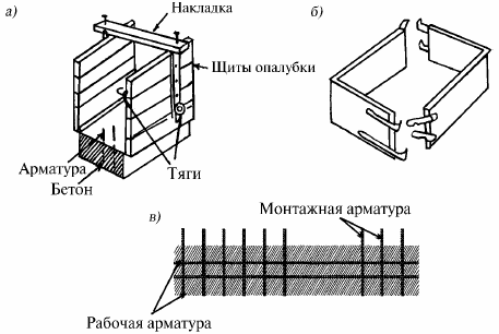 Рис. 10. Железобетонная конструкция: а) общий вид конструкции; б) металлическая опалубка разъемная; в) фрагмент арматуры в разрезе