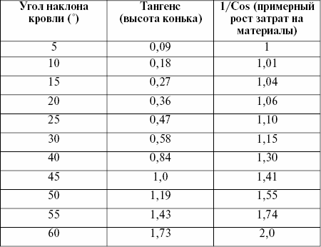 Для расчета высоты конька крыши используется таблица тангенсов (см. табл. 4).