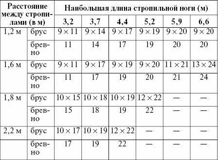 На стропила обычно используются брус или бревна, толщина которых зависит от веса кровли, расстояния между стропильными фермами, ветровых нагрузок, а также от длины стропильных ног, причем древесина для стропил используется только первого сорта, с минимальным количеством сучков. Сечения стропильных ног подбираются по специальным таблицам (в частности, по таблице 5).