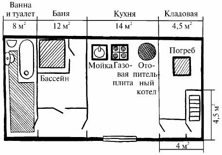 Внутренняя планировка дома индивидуальной застройкиДома индивидуальной застройки чаще всего возводятся в несколько уровней (этажей), при этом максимально используется цокольный этаж (или этаж в земле). В цокольном этаже размещают: кухню и столовую (площадью 12–14 м2), туалет, совмещенный с ванной (площадью 8 м2), кладовую для хранения различных веществ и консервированных продуктов (площадью 4,5 м2), баню (или сауну) с бассейном небольших размеров (12 м2)(см. рис. 11). Общая площадь цокольного этажа составляет 47 м2. Над цокольным этажом располагается первый этаж с верандой у главного входа в дом.