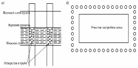 Рис. 12. Схема дренажа участка застройки с помощью перфорированных металлических труб: а) вид в разрезе; б) вид сверху