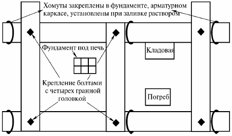 Рис. 17. Схема соединения брусьев (или бревен) способом врубки при сооружении деревянного дома (вид сверху) на монолитном ленточном фундаменте