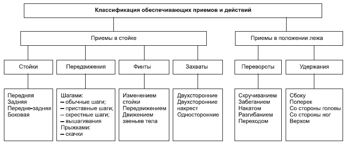 Третий уровень предполагает разделение приемов по их ведущим биомеханическим признакам. В качестве основных выделяются стойки и перемещения, удары (рукой и ногой), приемы борьбы.