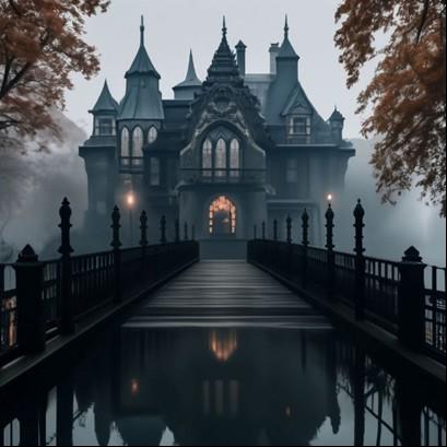 Туман пришёл в движение, словно расступаясь от моста. Перед зрителями открылось озеро. В центре дом в готическом стиле. Здание имело множество башен и шпилей. К острову перекинулся мост из металла, украшенный богатыми кружевами ковки. В начале моста вместо настила водяное зеркало. Всё какое-то усредненное, расплывчатое.