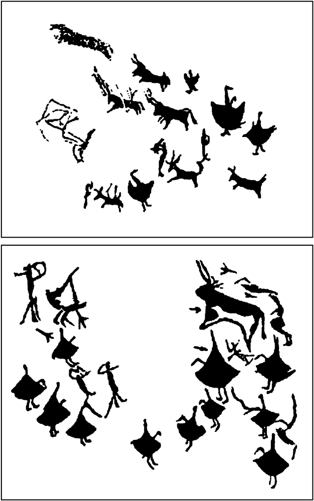 На других рисунках можно увидеть вооруженные конфликты между группами людей. Мужчины образуют хорошо знакомый зоологам «павианий» полумесяц, причем иерархи стоят под его прикрытием. Несколько картин дают доказательство того, что, подобно быкам, мужчины тоже организованы в иерархическую пирамиду. На других картинах мы видим доение коров, этим заняты женщины.