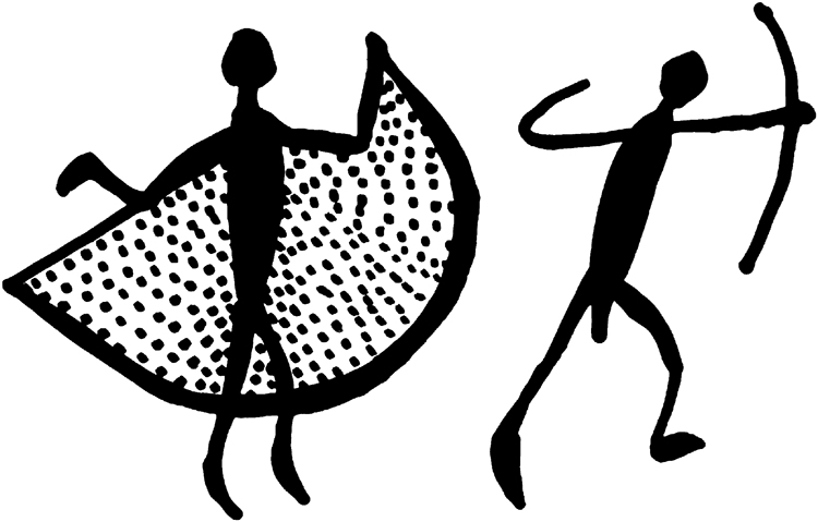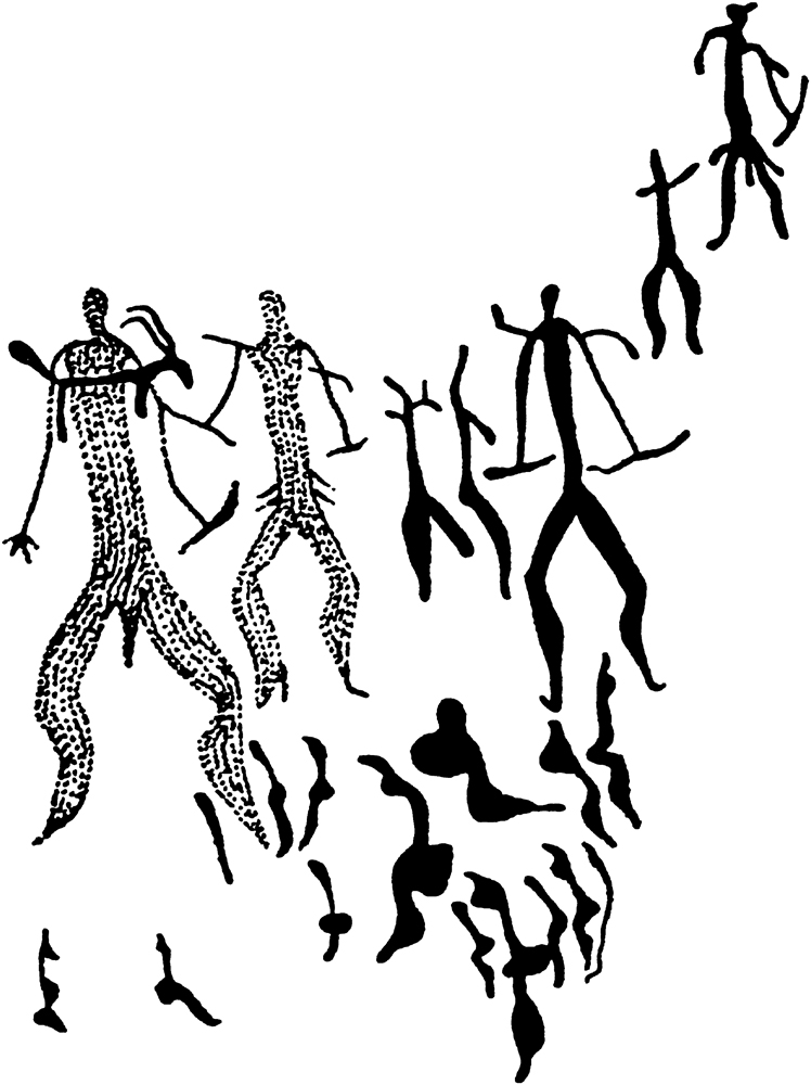 Возвращение бригад с охоты. На плечах у охотников палки-носилки (вроде коромысла), за спиной торбы, в руках орудия. Женщины (в правом нижнем углу) встречают их в позе подчинения – на коленях и с опущенными головами. Мужчины во много раз выше женщин, это отражает их несомненное превосходство над женщинами. У последних грудь и ягодицы нарисованы преувеличенно, что отражает, чем они ценны для вернувшихся из похода. Наскальный рисунок. (Я вижу сцену патриархата. А вы, читатель?)