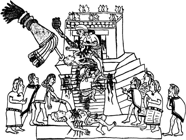 Ритуальное жертвоприношение пленников у ацтеков. Жрец показывает толпе бьющееся сердце; предыдущая жертва с вырванным из груди сердцем лежит у подножия пирамиды. Черное – потоки крови. Мысленно умножьте все показанное на рисунке в десятки раз, чтобы представить себе толпу людей, высоту пирамиды и количество принесенных в жертву пленников. Ацтеки гордились тем, что они покончили с каннибализмом, но с кровожадностью масс покончить еще не могли.