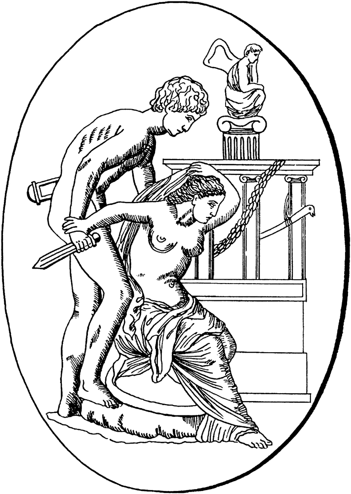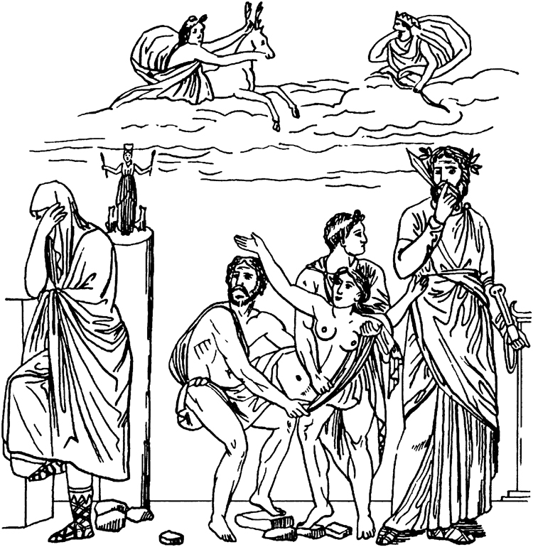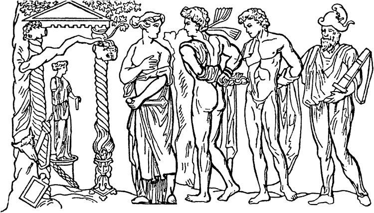 Древнегреческие герои Орест и Пилад (в центре, связаны) были пойманы в Таврии (Крым) местными жителями и приведены к храму Артемиды на заклание. Милая девушка слева – жрица, для нее отрезать голову – дело обычное: колонны храма увешаны человеческими головами. Оресту и Пиладу повезло: жрицей оказалась сестра Ореста, и она помогла им убежать.
