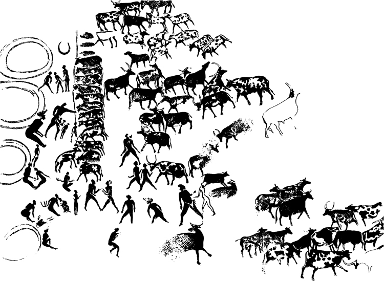 Кочевники Сахары не надевали на быка ярма и не запрягали его. Они ездили на быках верхом! Они были великолепными селекционерами. По наскальным рисункам мы видим, что они создали две до сих пор остающиеся элитными линии скота: черно»пегую и красную. Причем умудрялись сохранять эти две линии несмешивающимися в одном стаде. А ведь для этого нужно управлять спариванием животных.