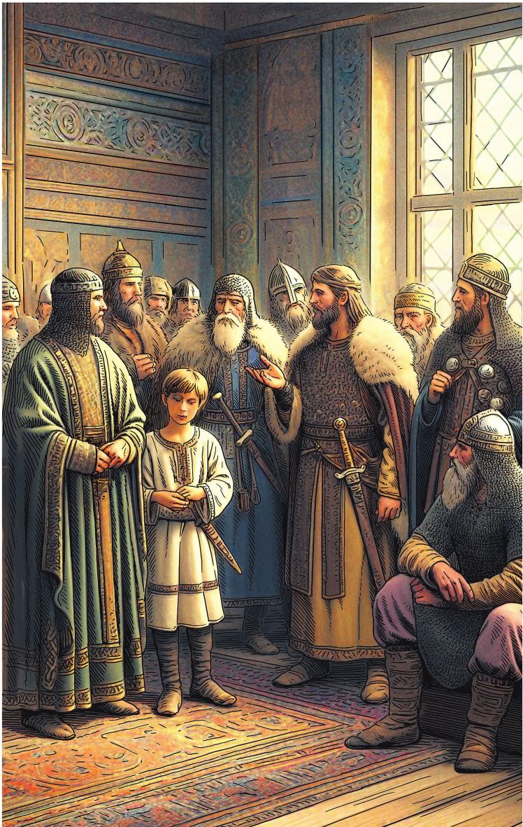 Несколько оробев, Владимир двинулся вдоль строя ратников к крыльцу терема, на котором стоял великий князь Святослав, также облачённый в праздничные одежды. Справа от князя замер его наставник и воево-да Свенельд, а слева – сыновья, семилетний Ярополк и пятилетний Олег.