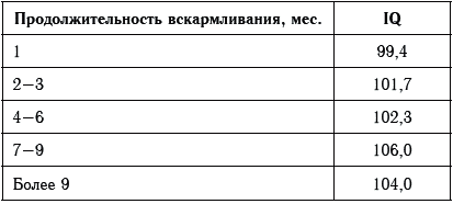 Таблица 3 Зависимость IQ взрослых от продолжительности материнского вскармливания