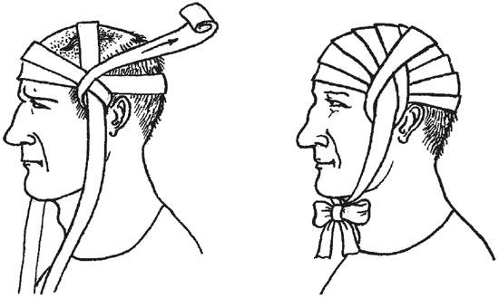 Пожалуй, пращевидная повязка ран головы – одно из самых ярких доказательств того, что все гениальное просто. Концы «вожжей», после того как рана прикрыта 4—5 слоями бинта, связываются между собой. Такая повязка никогда не свалится. При накладывании повязки держать «вожжи» может или сам пострадавший, или помощник.