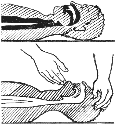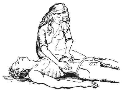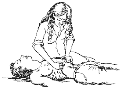 Для вдоха реберные дуги пострадавшего приподнимают вверх. Выдох осуществляется при надавливании ладонями на нижние ребра вниз. При реанимации по способу В.П. Дядичкина через каждые 15 толчков в среднюю часть грудины (массаж сердца) выполняется два цикла «вдох – выдох».