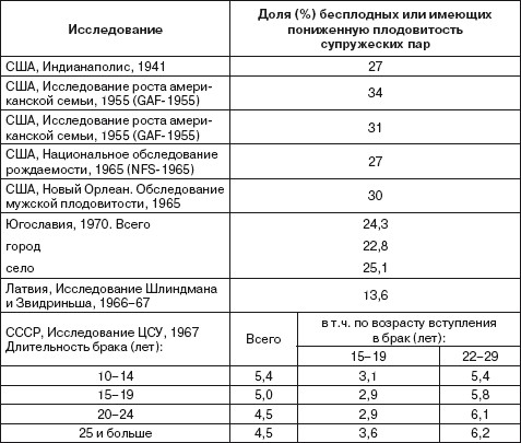 В науке существуют различные оценки бесплодия, сделанные разными авторами и в разное время, однако в целом можно считать, что в современных экономически развитых странах около 10–15 % брачных пар бесплодны абсолютно (т. е. имеют нулевые шансы на рождение ребенка) и столько же – относительно (т. е. обладают пониженной плодовитостью). В табл. 6.1 приведены данные о распространенности бесплодия, приводимые в работах разных авторов.