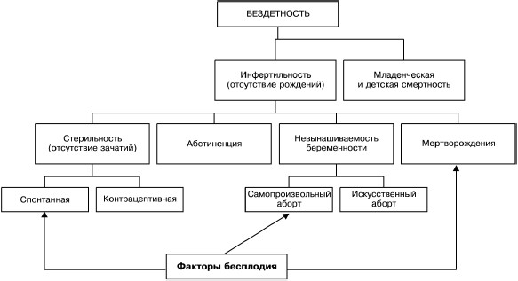 Инфертильность вместе с возможными случаями смерти детей является фактором бездетности, т. е. отсутствия детей в семье. Взаимосвязь этих понятий отражена на схеме 6.1.