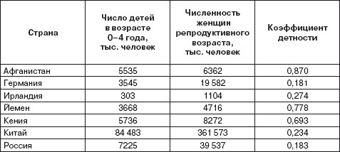 В России величина коэффициента детности по данным переписи населения 2002 г. составляла 0,160, в т. ч. в городах – 0,144 и в сельской местности – 0,211, т. е. на 46,3 % больше[337]337