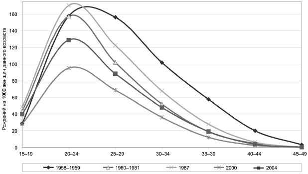На графике 6.2 приведены кривые изменения повозрастных коэффициентов рождаемости для населения России в 1958–2004 гг. Различия в виде кривых характеризуют процесс снижения рождаемости в России в этот период. Как видно из графика, низкой рождаемости соответствует не только меньшая высота кривой, но и ее больший сдвиг влево, к оси ординат, т. е. левосторонняя асимметрия.