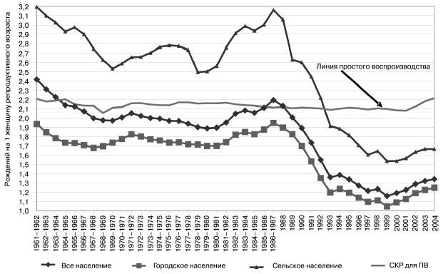 Динамика суммарного коэффициента рождаемости в России в 1961–2004 гг.