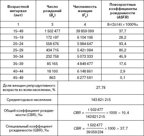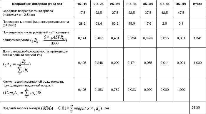 В табл. 6.5 на примере данных о повозрастных и суммарных коэффициентов рождаемости в России показана техника расчета всех этих показателей. Полученное значение среднего возраста матери при рождении лишь на 0,13 отличается от официальных данных Госкомстата РФ (25,9 лет[344]344