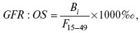 где GFR : OS – специальный коэффициент рождаемости по порядку рождения; Bi – число рождений i-той очередности; F15–49 – среднегодовая численность женщин репродуктивного возраста. Как видно из определения этого показателя, сумма специальных коэффициентов рождаемости по порядку рождения равна просто специальному коэффициенту рождаемости: