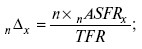 • доля суммарной рождаемости nΔx, приходящаяся на определенный возрастной интервал (x + n) лет. Рассчитывается как частное от деления соответствующего повозрастного коэффициента на коэффициент суммарной рождаемости (здесь повозрастные коэффициенты выражены в расчете на 1 женщину соответствующего возраста):