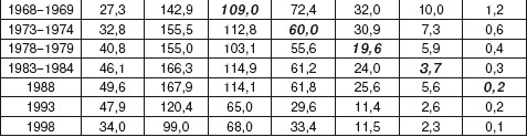 Здесь в строках приведены значения повозрастных коэффициентов рождаемости для каждого из перечисленных периодов. Числа на главной диагонали, выделенные полужирным курсивом, – это повозрастные интенсивности рождаемости реального поколения, родившегося в 1940—43 гг. и которому в 1958—59 гг. было от 15 до 19 лет.