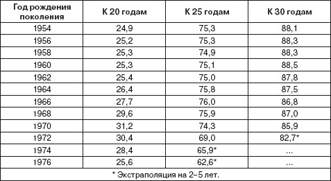 При этом спейсинг рождаемости измеряют при помощи различных показателей. Одним из них является как раз средний возраст рождения ребенка той или иной очередности (об этом показателе применительно к гипотетическому поколению шла речь в предыдущем параграфе этой главы). Кроме того, возможен расчет доли женщин, родивших ребенка той или иной очередности к тому или иному возрасту. Например, в табл. 6.7 в качестве иллюстрации показано, как изменялась доля женщин, родивших хотя бы одного ребенка к возрасту 20, 25 и 30 лет.